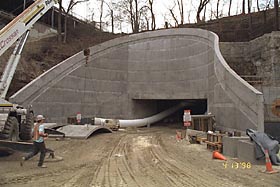 Construction involved mining caverns and tunnels into easily excavated St. Peter Sandstone along the Mississippi River, with a total footprint of 106,000 square feet and an excavated volume of 100,000 cubic yards. Each of the two caverns is 600 feet long, 25 feet high, and 70 feet wide with an overhead limestone roof.
